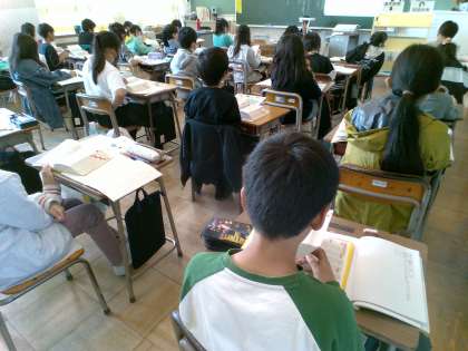 漢字辞典の引き方を学習しています。部首索引、音訓索引、総画索引などの引き方があることから、「分かりやすいね」「部首にも意味があるんだ」と、自分の調べたい漢字をどんどん調べていく子供たちでした。