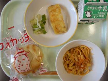 献立は、フォッカチャ、ホキのイタリアンレモンソースかけ、グリーンアスパラのコントルノ、ラグーアッラボロネーゼ、牛乳です。