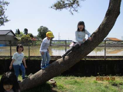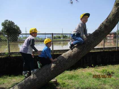 グラウンド探検で「木登り」をする子供たち。上手に登っていて、びっくりしました。