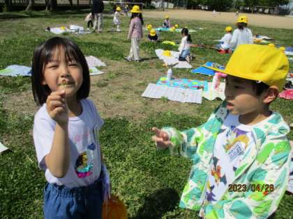 グラウンド探検では、四つ葉見付け名人、花束作りなど、植物となかよしになる人がいっぱいいました。