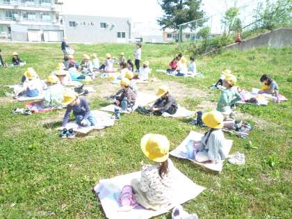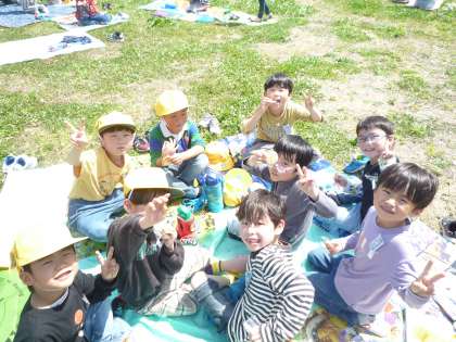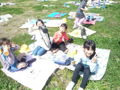 グラウンドでピクニックをしました。ちょっとだけおやつも食べられて嬉しそうな1年生でした!!