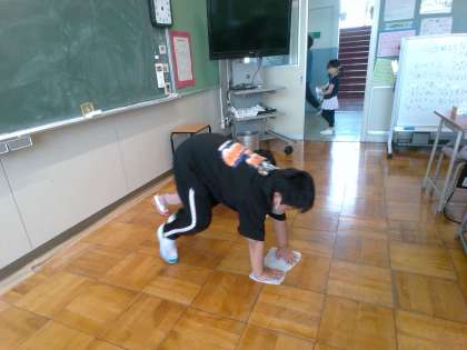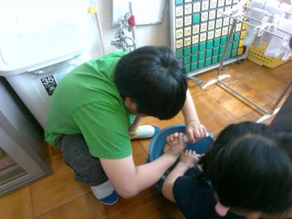 金曜日の清掃活動は水拭きでした。手のひらで力強く、床を拭いたり、雑巾を洗って絞ったり・・・。難しいときには、上級生が手本を示しています。