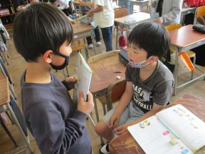 外国語活動では、いろいろな国の挨拶を学習しました。「日本はお辞儀をするけれど、アメリカは握手をするんだね」とそれぞれの文化の違いを楽しみました。その後、英語で挨拶をし、自分の好きなものを紹介しました。「一緒にやろう!」と自分から声をかけている人もいるなど、子供たちは笑顔で英語を使ったやり取りを楽しんでいました。