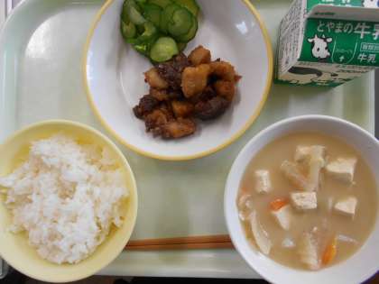 今日の献立は、ご飯、豚肉とレバーの揚げからめ、きゅうりもみ、ごまけんちん、牛乳 です。