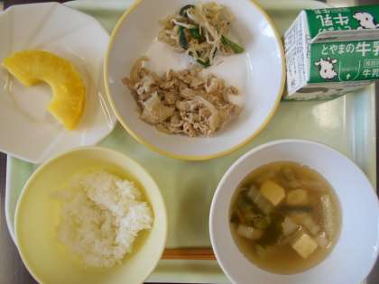今日の献立は、ご飯、豚肉の生姜焼き、ナムル、中華スープ、パインアップル、牛乳 です。