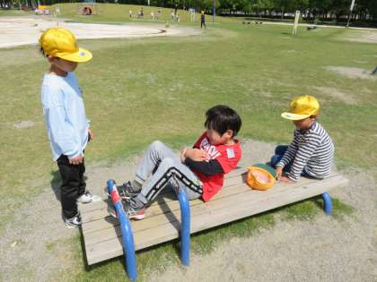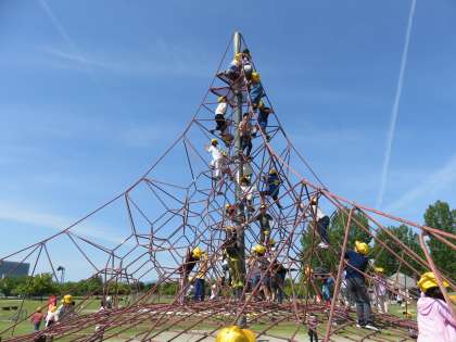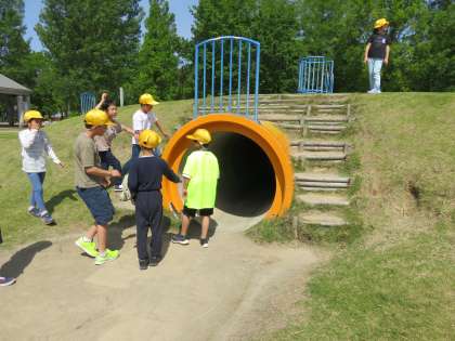 楽しみにしていた町探険。最初の目的地は、富山県総合運動公園のげんき広場です。アスレチックでダイナミックに遊んだり、運動遊具で筋トレをしたり、思いっきり遊んでいました。