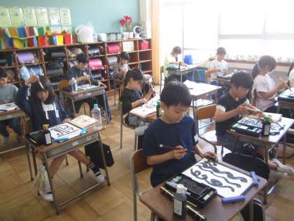 今日は、初めて毛筆をしました。「早く黒い墨で書きたい!」と意欲的な子供たち。ひじを上げて、筆と一緒に動かす練習をしました。自然と姿勢がよくなり、一生懸命に練習していました。