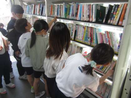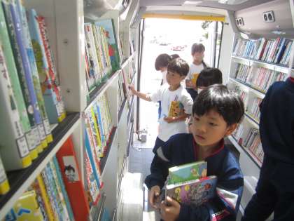 今日は、今学期、最初の自動車文庫の日。久しぶりでワクワクする子供たち。「どれにしようかな」「あっ、これ面白そう!」と、本の中身や表紙を見ながら選んでいました。