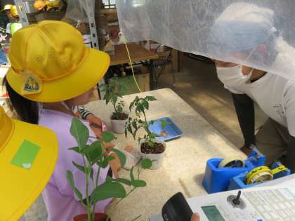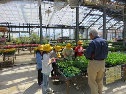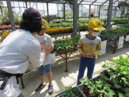 枝豆の苗には「黒豆」「茶豆」「緑豆」の3種類があって、どの苗にしようか、すごく悩んでいましたが、「黒豆」にしようと自分で決めていました。買い物に来ていた地域の人に話しかけられ、しっかりと答えていました。購入した苗をレジに持って行き、財布を開いて上手に代金を支払っていました。ポットにシールを貼ってもらいレシートをもらうと、とても嬉しそうでした。