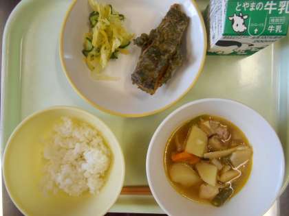 今日の献立は、ご飯、魚の磯辺(いそべ)揚げ、あわせ和え、筑前(ちくぜん)だき、牛乳 です。