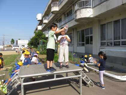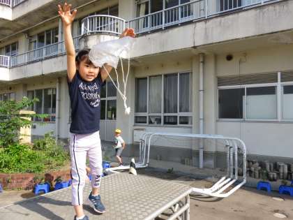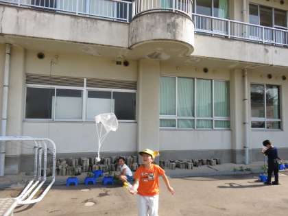 国語科「たんぽぽの ちえ」で、「綿毛の一つ一つが広がると落下傘のようになり、綿毛についている種をふわふわと飛ばす」ことを学習しました。早速、家でビニル袋や毛糸などで落下傘を作ってきた子供が、高いところから飛ばして試していました。今朝は風が少しあったので、5メートルほど飛ばされていきました。興味をもったことを試しながら、学習を深めていました。