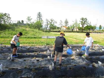 今日、明日は6年生さんが宿泊学習なので、新保小の最高学年は5年生。普段は6年生さんがしてくれているサツマイモの水やりですが、今日は5年生が責任をもってやりました。頼もしいです。