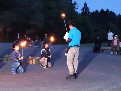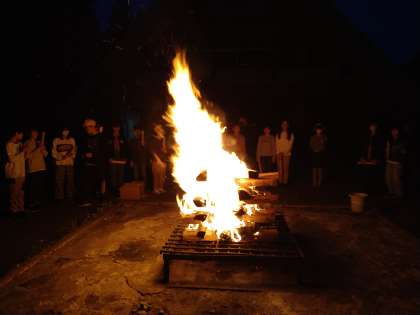 1日目最後のイベント、キャンプファイヤーです。みんなで薪を火の中に投げ入れました。