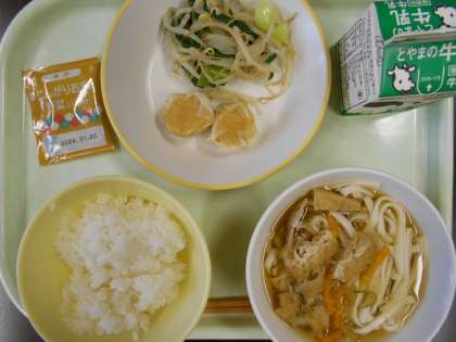1年生は、学校の給食で初うどんでした。みんなでおいしくいただきました。