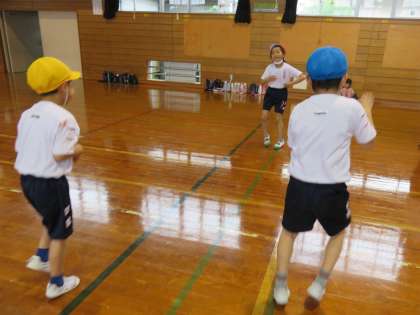 ロックの軽快な曲のリズムに乗って、即興的に踊って楽しみます。今日は、ミラーマンのまねをしました。友達と全身を弾ませて踊っていました。