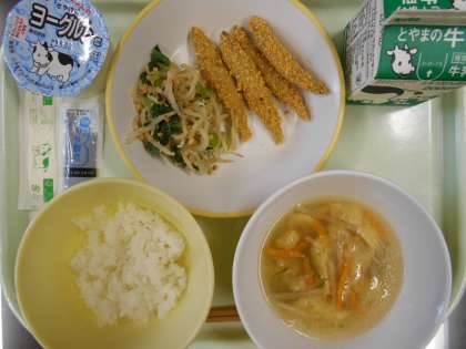 今日の献立は、ご飯、きびなごのサクサク揚げ、炒り大豆和え、うすくず汁、海苔の佃煮、ヨーグルト、牛乳 です。