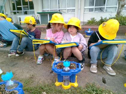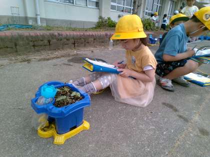 探検バッグをもってアサガオの観察に行きました。初の探検バッグも嬉しそうでした。見付けたことや気持ちをプリントに書きました。