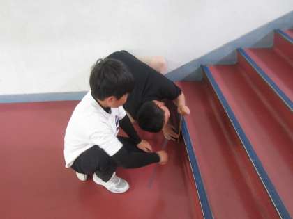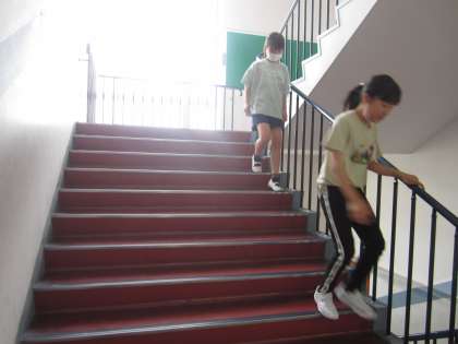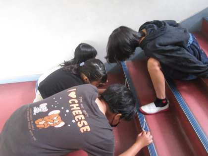 比例の学習のまとめとして、学校の中央階段と西階段の階段一段分の高さを測り、1階から3階までの段数を数え、1階から3階までの高さを計算で求めました。