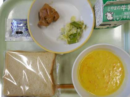 今日の献立は、食パン、照り焼きチキン、イタリアンサラダ、かぼちゃのポタージュ、ブルーベリージャム、牛乳 です。
