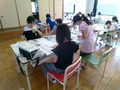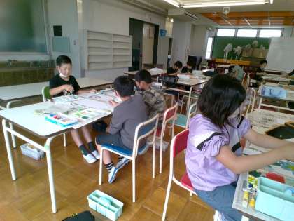 「まぼろしの花」をテーマに花の色、葉っぱの形、生えている場所などいろいろ想像を膨らませて絵をかいています。色のつくり方、前回の学習で学んだスパッタリングをつかうなどたくさんの工夫が見られます。
