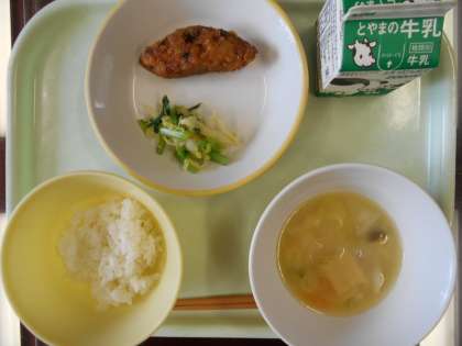 今日の献立は、ご飯、魚の竜田揚げ(ふくらぎ)、小松菜ひたし、呉汁(ごじる)、牛乳 です。