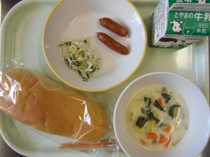 今日の献立は、コッペパン、あらびきウインナー、水菜のサラダ、クリーム煮、牛乳 です。