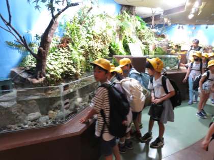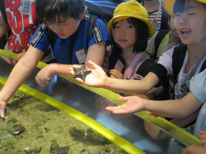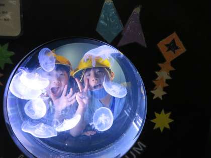 校外学習で魚津水族館に行きました。お気に入りの水槽の前では興味深そうに見入ったり、ふれあいコーナーではヤドカリやヒトデを手に取ったりしていました。