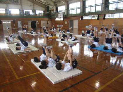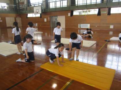 今日は、グループに分かれて前転、後転の撮影をしました。撮った動画を見て、「頭をこのへんにつけると、まっすぐに回れるんじゃない?」「勢いをつけてやってみると、いいよ」とアドバイスし合いながら、一生懸命に取り組んでいました。