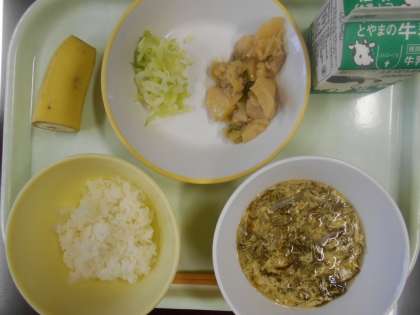 今日の献立は、ご飯、あっさりチキン、そえ野菜、卵ともずくのスープ、バナナ、牛乳 です。