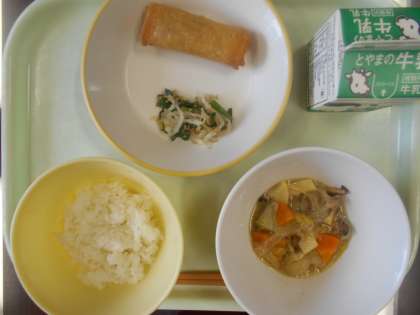 今日の献立は、ご飯、春巻き、塩ナムル、八宝菜、牛乳 です。