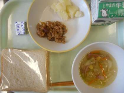 今日の献立は、食パン、チリコンカン、こふきいも、キャベツスープ、ポケットチーズ、牛乳 です。