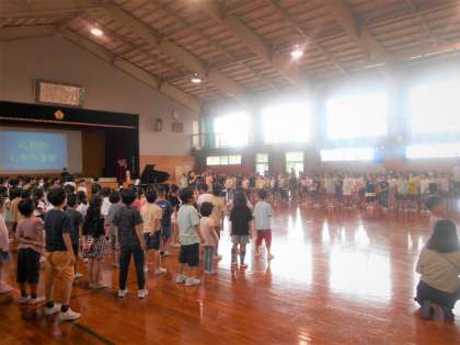 今日の新保っ子タイムは「歌声集会」でした。「にじ♩」をみんなで心を一つにして歌いました。明日の「陸上交流会」に出場する選手の子供たちの紹介もありました。