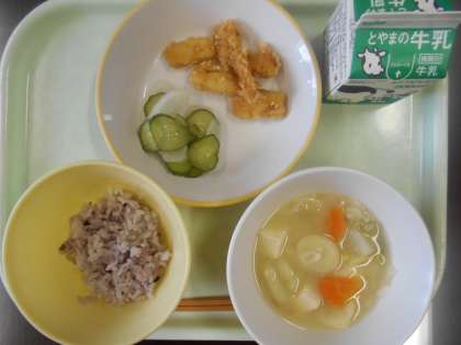 今日の献立は、雑穀入りご飯、イカのかりん揚げ、2色ピクルス、すいとん、牛乳 です。