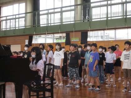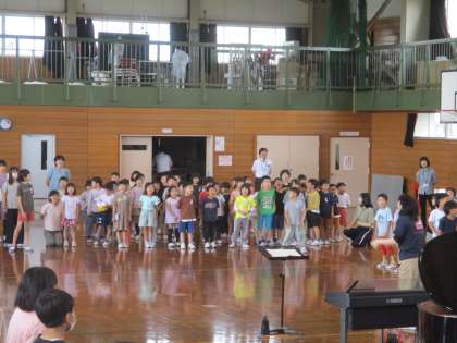 今年度1回目の歌声集会を行いました。1ヶ月間朝練習していた「にじ」を全校で歌いました。大きくのびやかな歌声が体育館中に響き渡りました。全校の心が一つになり、子供たちにも楽しそうに歌っていました。