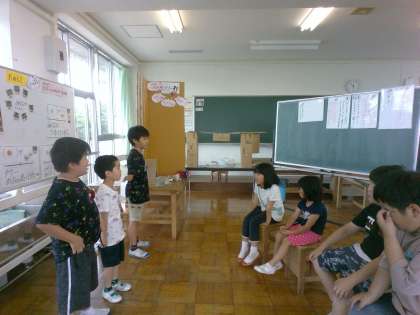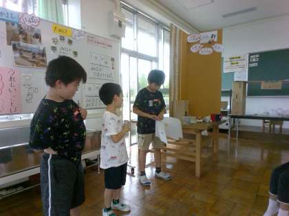 前々から、アイディアを出し合って作ってきた『ダンボールゆうえんち』。今日はいよいよ、さくら2組の友達を招待しました。わくわくしながら部屋に入ってきた友達を笑顔で迎えました。はじめの言葉を話す子供たちの表情からは、「友達を楽しませてあげてあげたい」という温かい気持ちが伝わってきました。