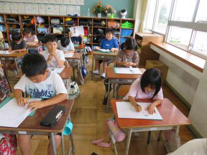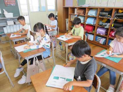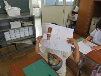 図工で、カッターナイフを使います。初めて使うので、使い方や約束を学習して、練習しました。力が入りすぎたり持ち方が悪かったりして、まっすぐ切るのもうまくいきませんでした。練習していくうちに、紙を切る感覚やコツがわかってきました。窓の形に切る練習もしました。子供たちは、切った窓から覗き込んで楽しそうでした。