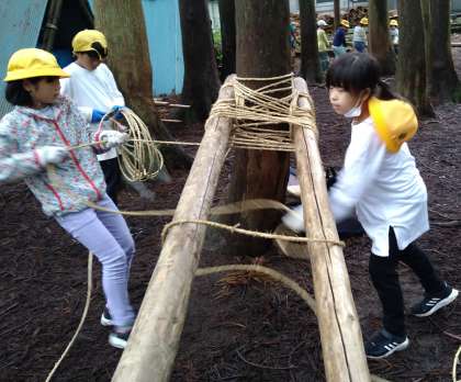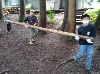 協力して丸太を運んだり、縄を縛ったりしています。