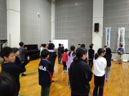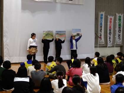 2日目の朝です。「朝のつどい」では、藤ノ木小学校の6年生さんと交流しました。ラジオ体操をしたり、学校紹介をしたりしました。