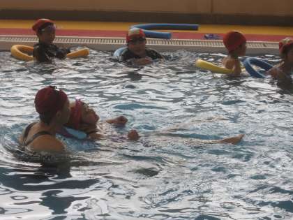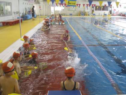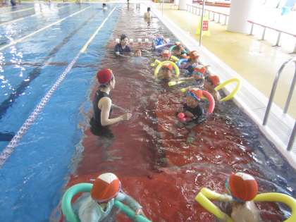 ビート板やプールスティック、フラフープ等を使いながら、楽しくレッスンを受けていました。「潜れるようになったよ」「クロールができるようになってきた」など、自分の成長を実感していました。