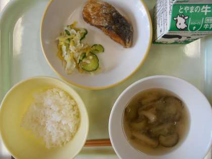 今日の献立は、ご飯、揚げ魚のレモン味、あわせ和え、具だくさん汁、牛乳 です。