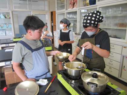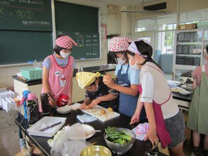 今日は、調理実習で「ほうれん草のおひたし」と「ゆでいも」を作りました。班で協力し、安全に気を付けて調理しました。