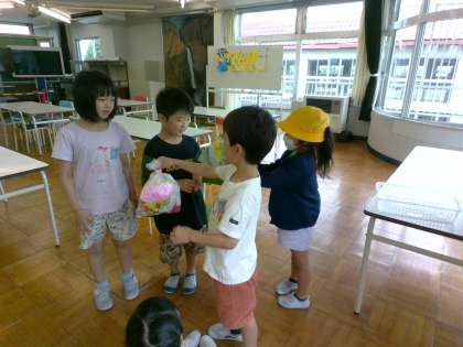 プレゼントは山盛りの折り紙作品。みんな作るのが楽しくて、量がたくさんになっています。
