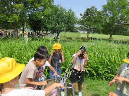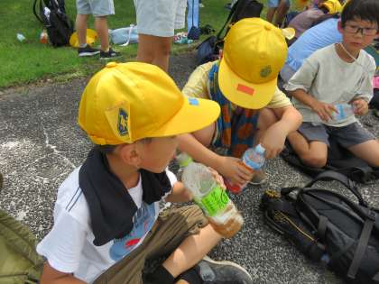 2年生:Go to まちたんけん その3:7月7日(金) 公開日 2023/07/07 更新日 2023/07/07 2年生の部屋 天気予報では、とても暑くなるとのことで・・・、 子供たちは、保冷のタオルを首に巻いたり、ペットボトルの水分を凍らせてきたり、暑さ対策をしていました。有り難いことに、風が吹いていたので、日陰に入ると涼しく感じるくらいでした。 帰る前には、タオルを水で冷やそうと水飲み場に集まってきた子供たち。水のかけ合い・・・というよりは、自ら水をかけていました。