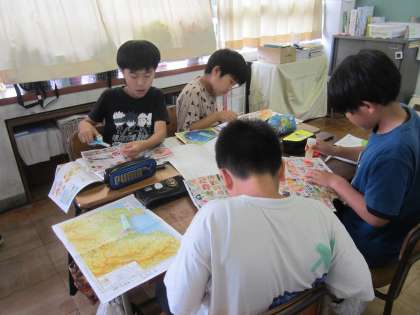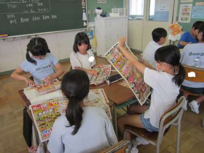 社会科の学習では、スーパーマーケットのちらしを使って、どんな食材がどこで生産されているかを調べ、日本地図に貼っていきました。