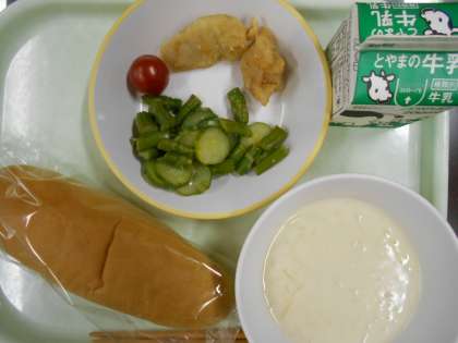 7月12日(水) 今日の給食&新保小学校 公開日 2023/07/12 更新日 2023/07/12 給食紹介 今日の献立は、コッペパン、フライドチキン、ビーンズポタージュ、アスパラサラダ、ミニトマト、牛乳 です。 今日の新保っ子タイムは、歌声集会でした。5年生の「ビリーブ」の発表の後、全校みんなで今月の歌「わになっておどろう」を歌いました。