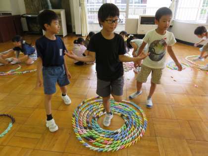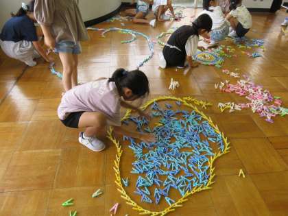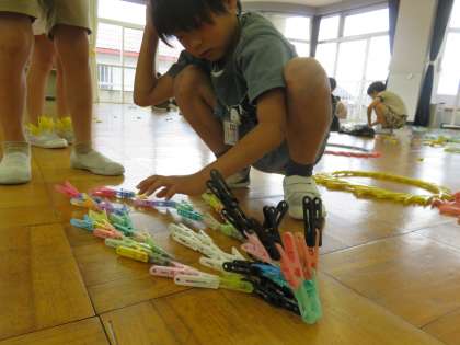 洗濯ばさみを並べたりつないだりして遊びました。海、太陽、街、恐竜、剣、飛行機・・・子供たちの想像が広がったり、友達と繋がったりして、楽しく活動できました。