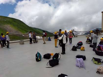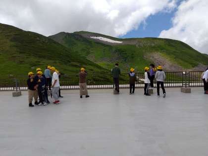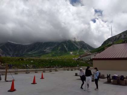 室堂ターミナルに到着しました。天気は、晴れです。が、頂上にはくもがかかっています。風は涼しです。