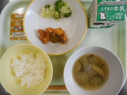 今日の献立は、ご飯、鶏肉とレバーのケチャップからめ、そえ野菜、なすのみそ汁、野菜ふりかけ、牛乳 です。