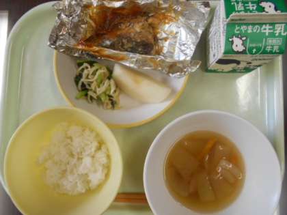 今日の献立は、ご飯、さばの銀紙焼き、はりはり和え、冬瓜スープ、梨、牛乳 です。