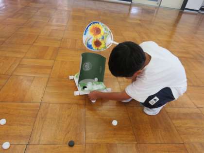 遊びながら、速く走るにはどうしたらいいか、いろいろと試しながら遊んでいました。また、偶然ぶつかり合ってバトルをしたり、物を載せて運んだり、遊び方も工夫していました。自分のヨットカーを作りたい意欲を高めていました。